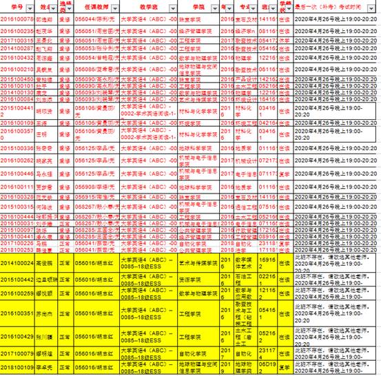 2020年4月19日,大学英语(四)期末考试结束后,304永利集团大英二教研室迅速对考试情况进行了整理,通过全体教员线上接龙,得出了考试情况:应考人数3499人,共有3461人参加考试,缺考人数38人,其中正常选课员工18人、重修生20人。