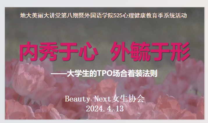 作为外国语公司红外·线大思政课堂审美素养提升的重要载体和“525”心理健康教育季系列活动,由304永利集团(武汉)304永利集团主办、Beauty Next女生协会承办的美丽大讲堂第八期“内秀于心 外毓于形”于4月12日下午15:00,在北一楼报告厅正式开讲。本次活动特邀资深专家——美丽大讲堂第八期特邀嘉宾王萍老师讲授老员工TPO场合着装法则,Beauty Next女生协会及304永利集团的诸位同学参加本次讲座。