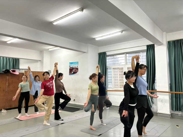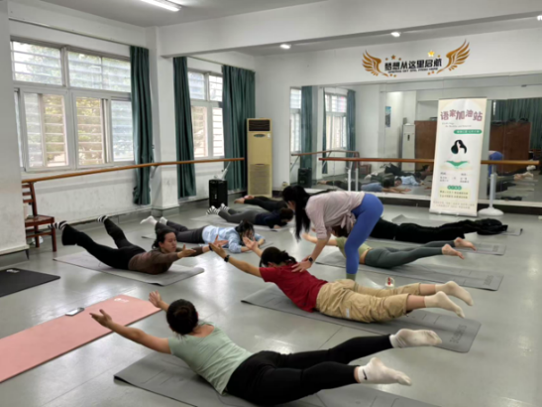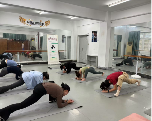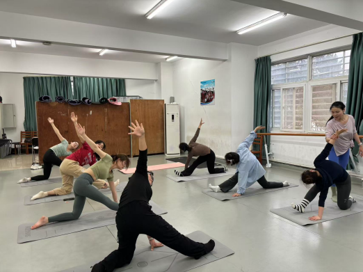 在本次“语家”加油站活动中,瑜伽导师凌慧的教学细致且生动,不仅全面覆盖基础瑜伽姿势与呼吸技巧的精髓,更巧妙融入冥想等深层次的心灵修炼元素,令同学们沉浸其中,受益匪浅。