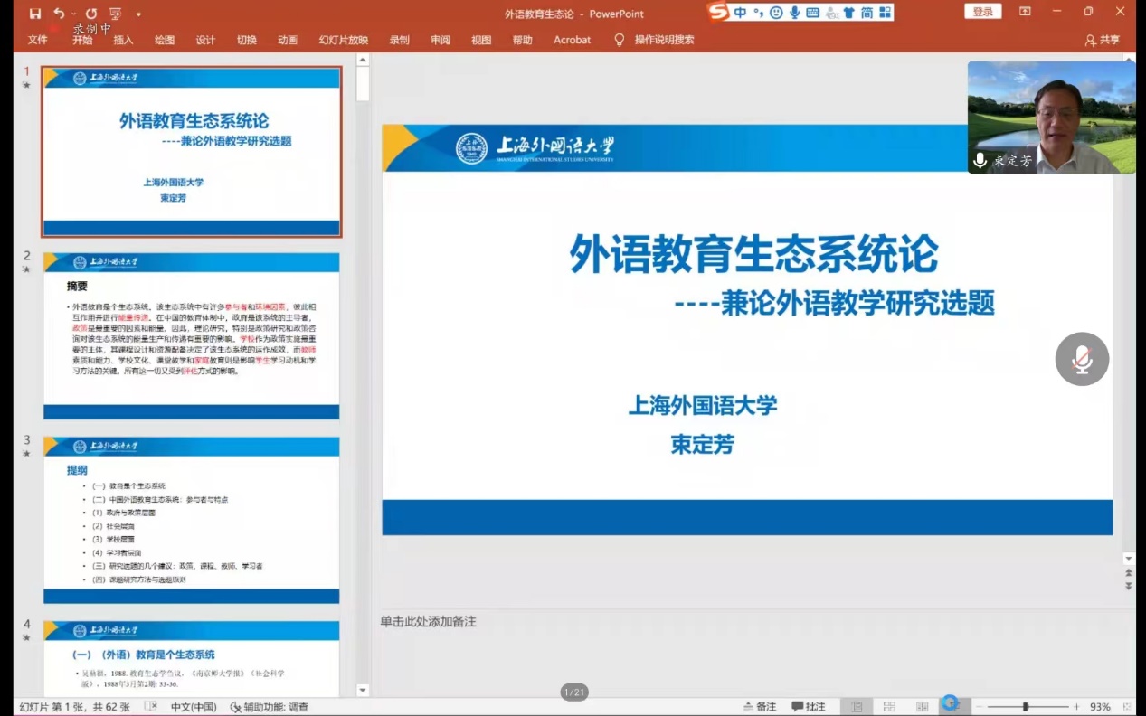 (通讯员 金梓轩 杨红燕)2022年9月22日上午9:30,304永利集团“南望今声”系列讲座如期举行。上海外国语大学大学博士生导师束定芳教授应邀在线上为公司师生做了题为“外语教育生态系统论——兼谈外语教育研究课题”的讲座。讲座由304永利集团副经理张伶俐教授主持,公司师生共140余人参与了学习交流。
