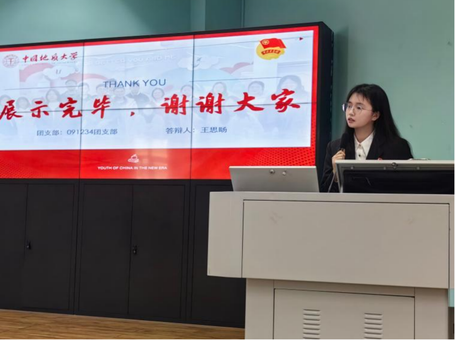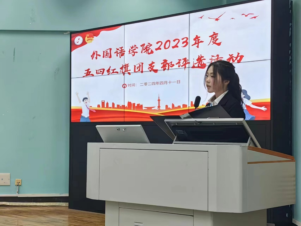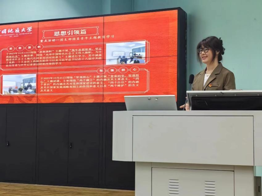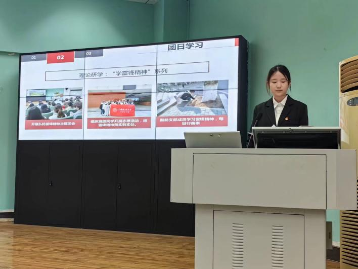 091234团支部书记王思旸以“青春砥砺,红旗领航”为主题,分别从支部结构、思想建设、活动开展、未来发展这几个方面来进行介绍,强调支部在开展团日活动时致力于从乐中学,,体现出091234团支部对于建设活力型、学习型团支部的积极性。