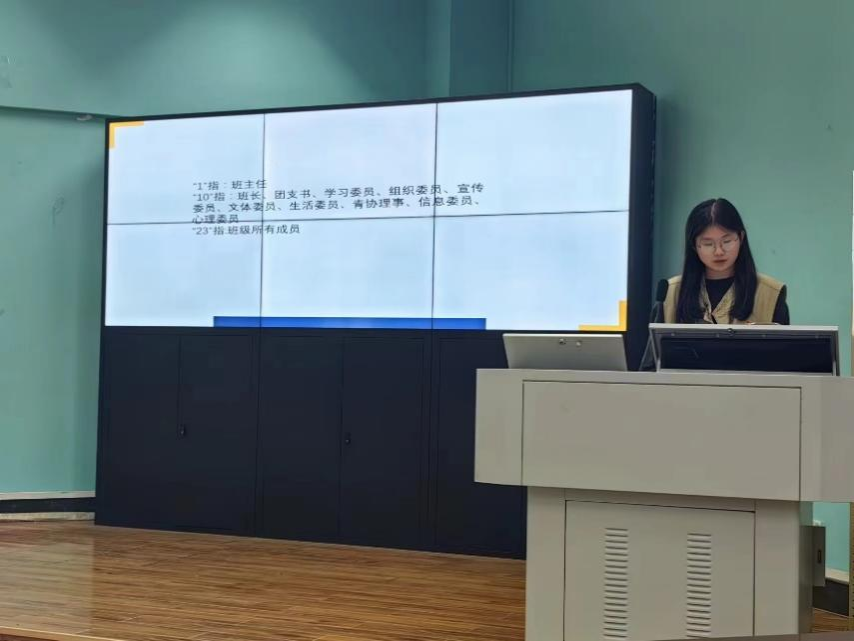 092211团支部书记毛雨菲以“青春筑梦,五四传承”为主题,围绕“筑梦先锋队、智慧启航灯、笃学新风尚、青春志愿行”四个篇章进行总体介绍。其中对思想建设方面进行重点介绍,强调团支部对于团日活动的开展的组织性、积极性。充分体现092211团支部积极向上的组织特点以及对于二十大精神的深刻理解、贯彻和落实。