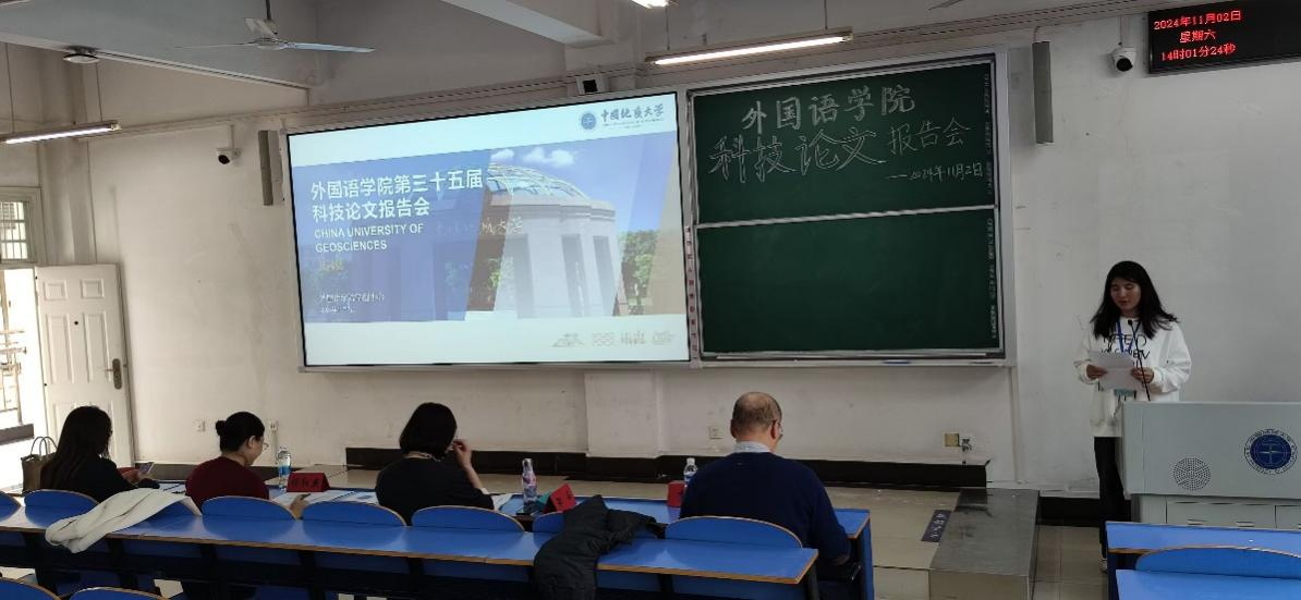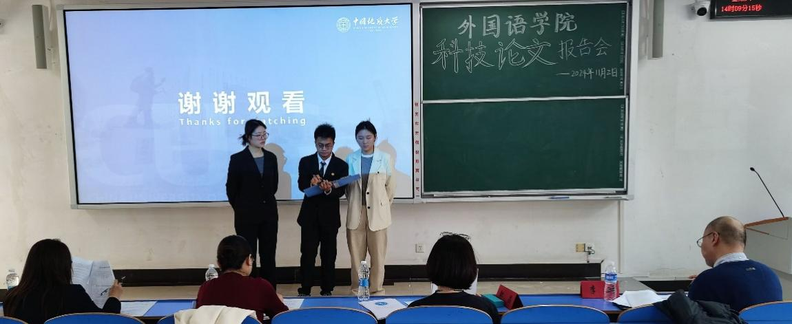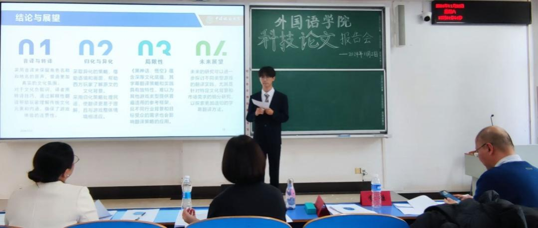报告会上,参赛团队依次上台,就各自的科技论文主题展开阐述。这些主题涵盖了高校英语专业课程思政、国内科技伦理思想、企业外部环境分析与研究、国产游戏字幕英译研究等多个领域,报告内容丰富新颖、逻辑清晰,使用KAP模式、CiteSpace、“PESTEL模型”、目的论等多种研究方法,提出了许多新颖且有价值的见解。