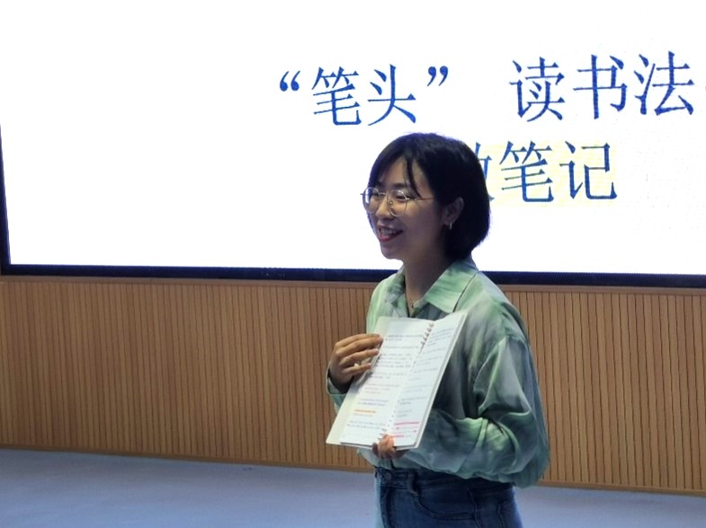 接下来,公司研究生德育助理郭文静分享了自己的读书心得。她以自己与“一角书屋”结缘以及领取稿费的两个小故事为引入点,用生动活泼、多样有趣的方式为同学们分享了自己的读书方法。郭文静将读书方法分为“笔头”、“心头”、“口头”,并且现场为同学们展示自己各类写满读书笔记的笔记本,引起了三(5)班小朋友们的极大兴趣。