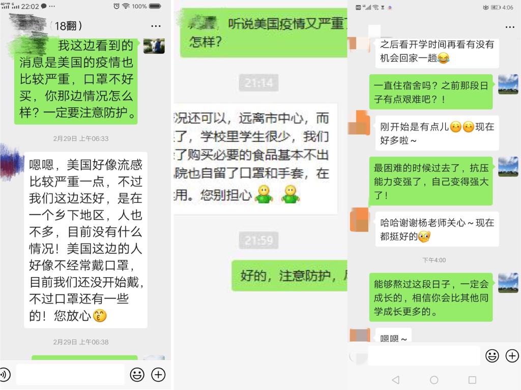 王伟老师的一个员工在美国孔子公司做汉语志愿者,在得知美国疫情加重之后,王老师经常与员工联系,提醒员工加强防护。杨红燕老师的一个员工整个寒假都留在公司,在疫情最紧张的时候杨老师一直与其保持联系,关注其生活是否有困难,鼓励她坚强成长。