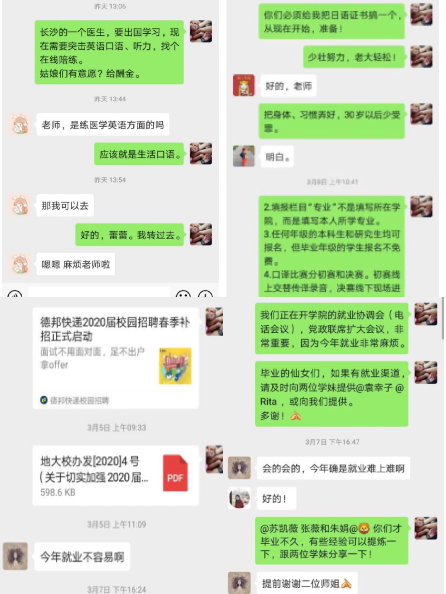 除公司和公司组织的网络双选会、空中宣讲会以及在线面试之外,导师们也都通过多种途径主动跟进毕业生就业意向、就业动态,不遗余力地寻找各类就业信息与途径,在自己有限的能力范围内尽最大可能帮助员工解决就业难题。王伟老师和汪卫红老师常在研究生群里发布专业相关招聘和培训信息。李孝奎老师通过电话与自己的研究生进行沟通,与研究生召开定期例会,就文献阅读,科研探索和实习实训等话题进行交流和指导。李老师今年的毕业研究生方同学面临着初步入职协议保底、签订意向协议、备战公务员考试等几种选择,目前疫情造成不少工作停滞,李老师在员工迷茫时常给予鼓励和建议。